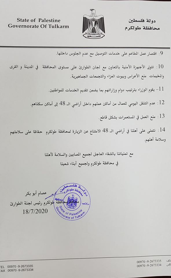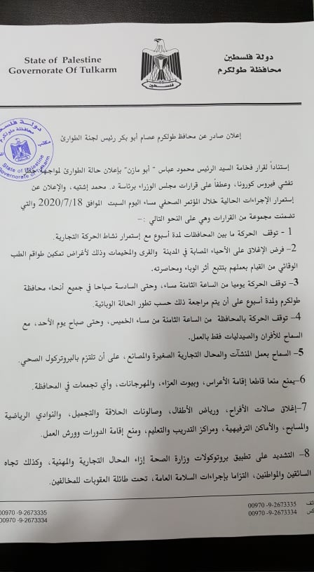 إعلان صادر عن محافظ طولكرم عصام أبو بكر بما يتعلق باستمرار الإجراءات الحالية في مواجهة خطر تفشي فيروس كورونا