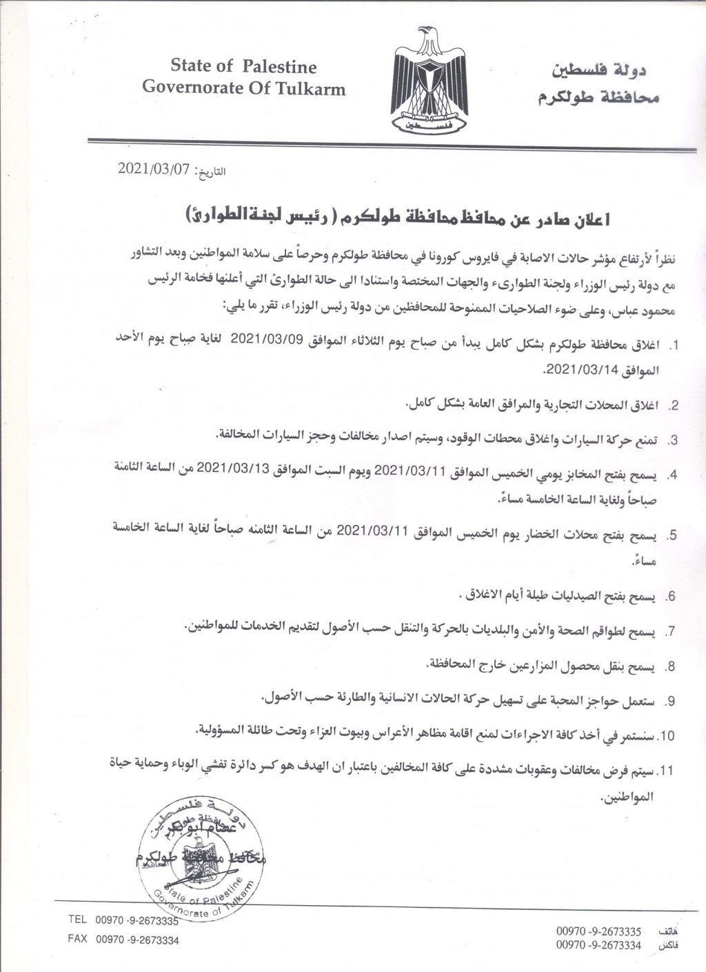 إعلان صادر عن محافظ طولكرم عصام أبو بكر بخصوص إغلاق محافظة طولكرم