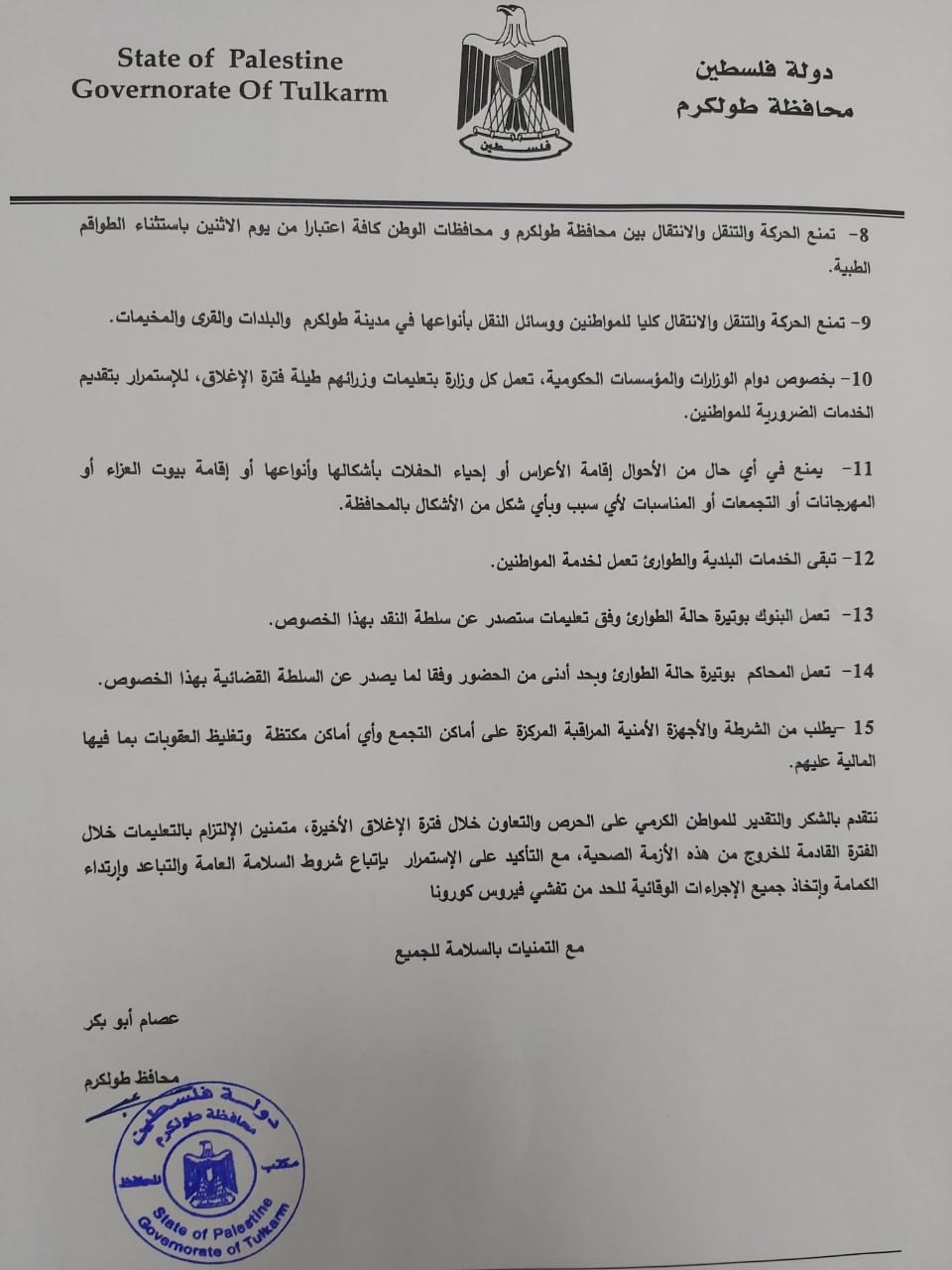 إعلان صادر عن محافظ طولكرم عصام أبو بكر رئيس لجنة الطوارئ بخصوص الإجراءات والقرارات الجديدة لمواصلة الجهود للحد من تفشي فيروس كورونا