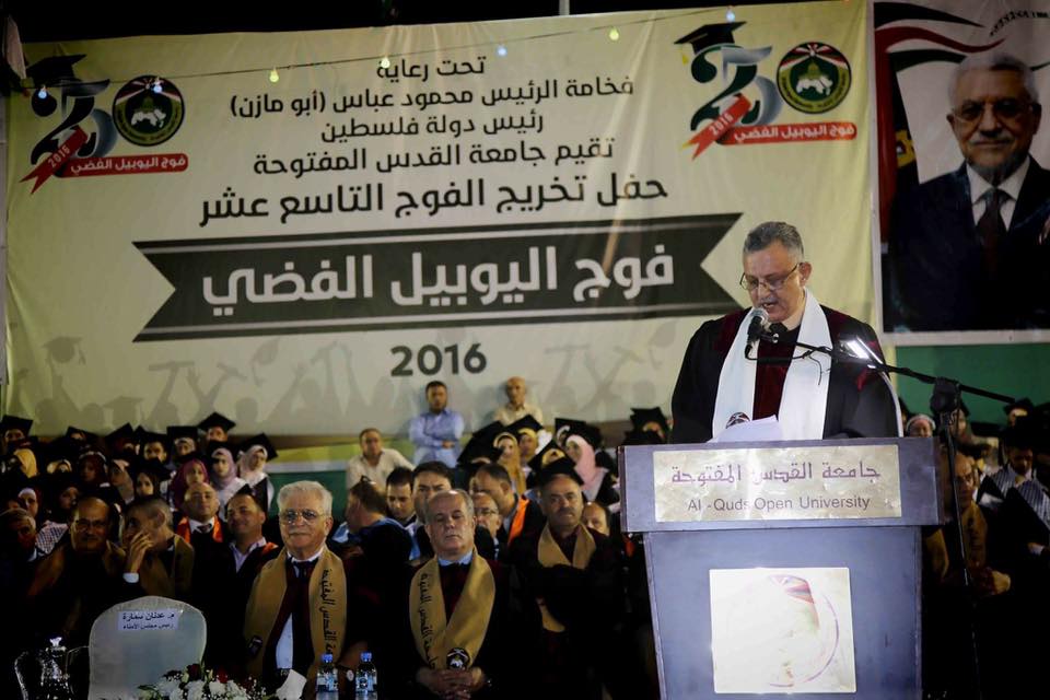 من جهته، تحدث رئيس الجامعة يونس عمرو عن التطور الذي حققته الجامعة منذ تأسيسها، لافتاً إلى أن الجامعة وفرت أحدث الأساليب لدعم العملية التربوية التي كان آخرها إطلاق فضائية القدس التعليمية، موجها التحية إلى الأسرى البواسل في سجون الاحتلال، خاصا بالذكر أسرى الجامعة. ودعا رئيس مجلس الطلبة القطري زياد الواوي الخريجين إلى الاهتمام بالإبداع والريادة لتحقيق التنمية في فلسطين، مؤكدا أن التعليم حق وأن الجامعات منصات معرفة بعيدا عن الخصخصة، وهذا ما دأبت عليه جامعة القدس المفتوحة. وألقت كلمة الخريجين الطالبة المتفوقة عفت شهاب، التي هنأت الخريجين وأهاليهم بالنجاح، موجهة الشكر للأهالي الذين سهروا من أجل تعليم أبنائهم، شاكرة إدارة الجامعة القدس المفتوحة والهيئتين الأكاديمية والإدارية لرعايتهما للطلبة.