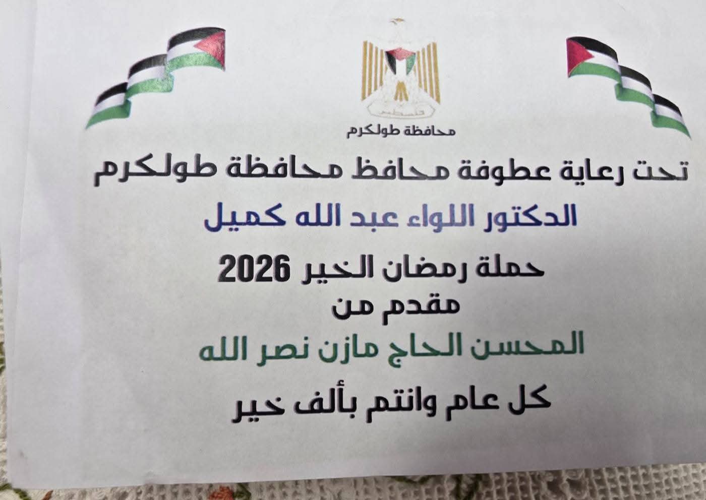طولكرم – 12-3-2026 تحت رعاية محافظ طولكرم اللواء د. عبد الله كميل و بحضوره، جرى تسليم مبلغ من المال بدعم من المحسن الكبير الحاج مازن نصر الله، كمساعدة لصالح الحالات المعوزة العاملين على خدمة المساجد من خلال مديرية أوقاف طولكرم، وذلك في إطار حملة “رمضان الخير ٢٠٢٦”