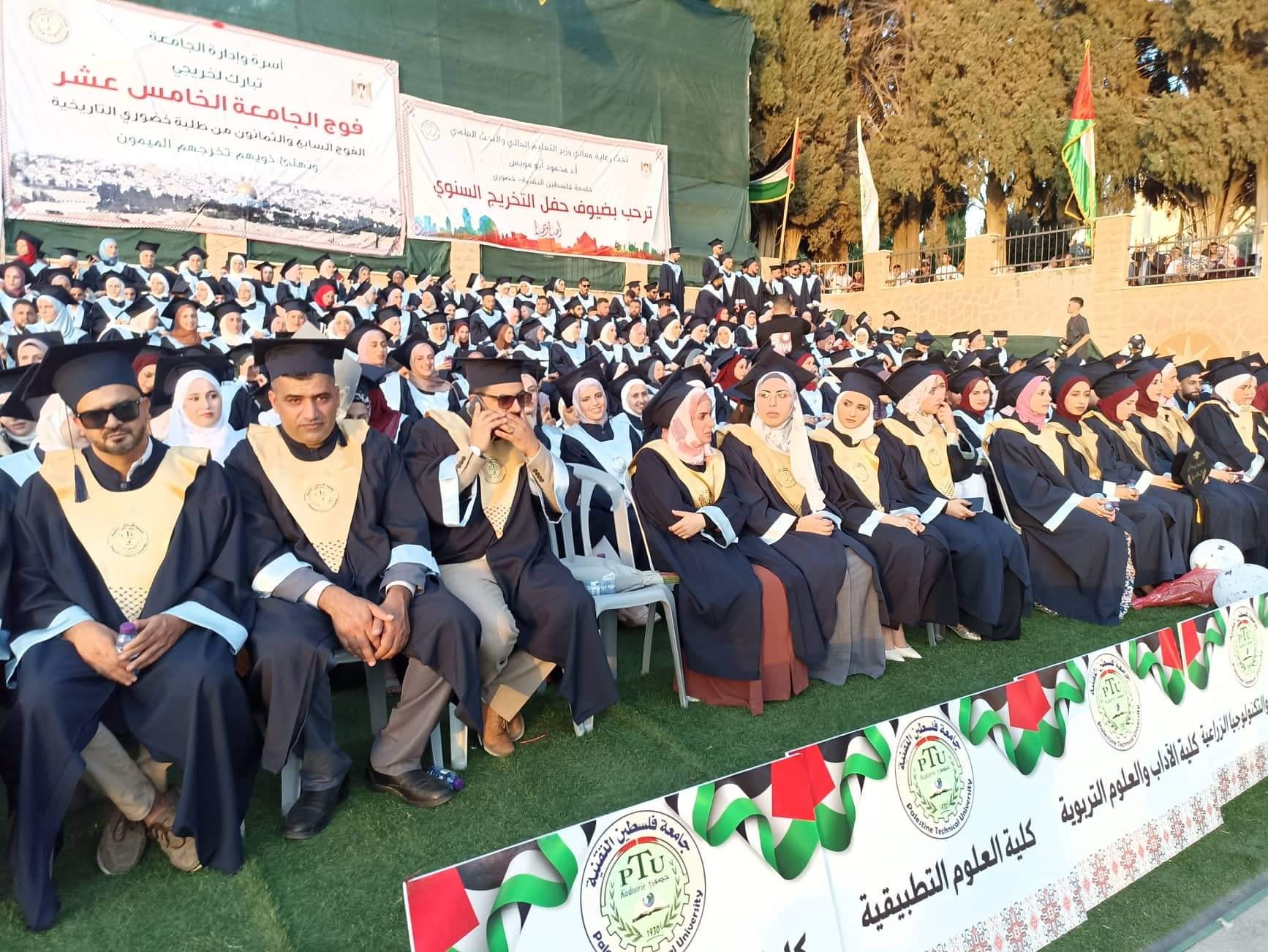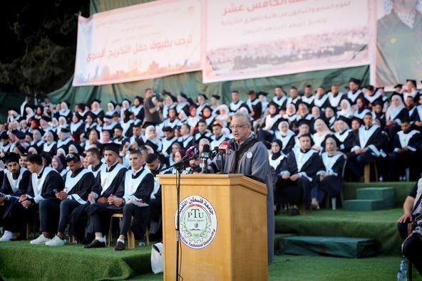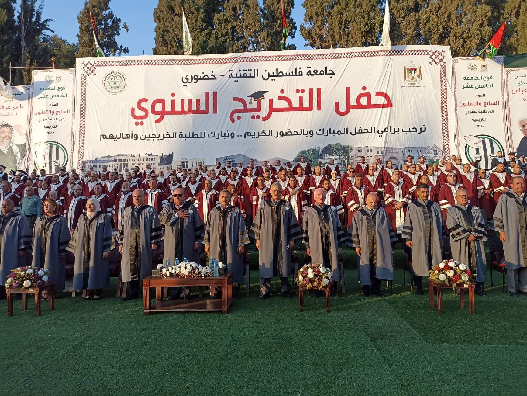 طولكرم – ١٧-٨-٢٠٢٢ احتفلت جامعة فلسطين التقنية ” خضوري ” بتخريج الفوج الخامس عشر للجامعة، الفوج السابع والثمانين من طلبة خضوري التاريخية، وبمشاركة محافظ طولكرم عصام أبو بكر، وعضو اللجنتين التنفيذية ومركزية فتح عزام الأحمد، ووزير التعليم العالي أ. د. محمود أبو مويس، ورئيس مجلس الأمناء م. مالك ملحم وأعضاء المجلس ، ورئيس الجامعة أ. د نور الدين أبو الرب، والهيئتين الأكاديمية والإدارية، ووزيرة شؤون المرأة د. أمال حمد، ورئيس هيئة مقاومة الجدار والاستيطان مؤيد شعبان، ورئيس سلطة جودة البيئة د. نسرين التميمي، وأمين سر حركة فتح بطولكرم إياد جراد ” أبو الصامد” وممثلي فصائل العمل الوطني، وممثلي المؤسسة الأمنية، والمؤسسات الرسمية والأهلية، ورئيس بلدية طولكرم د. رياض عوض، ورئيس الغرفة التجارية، ومجلس الطلبة وحركة الشبيبة الطلابية.