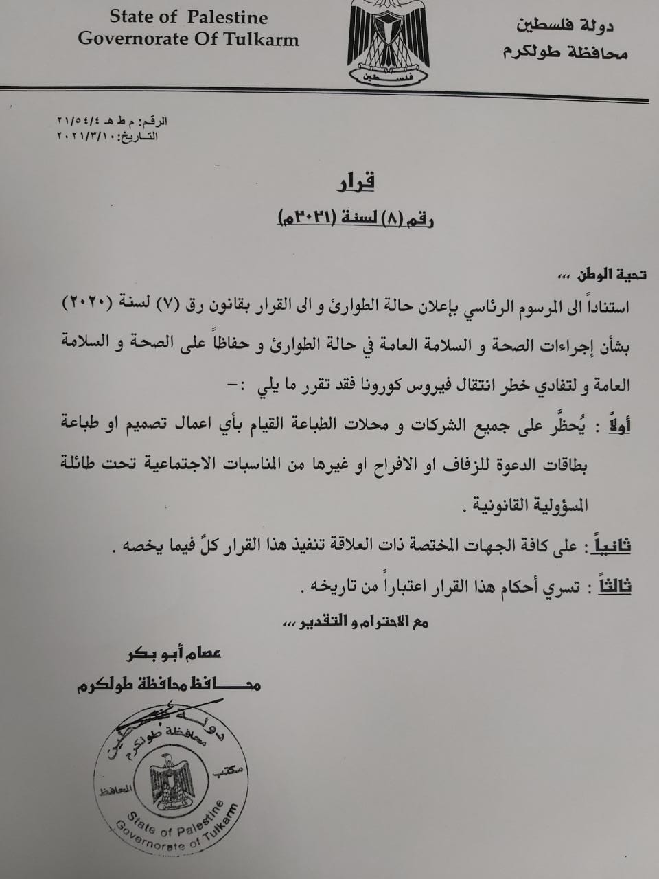 قرار صادر من محافظ طولكرم عصام أبو بكر بخصوص الحظر على جميع الشركات والمطابع بمنع طباعة بطاقات الأفراح والمناسبات