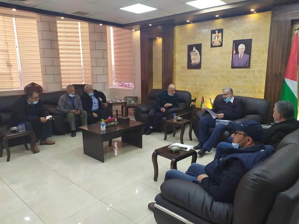 جانب من لقاء محافظ طولكرم عصام أبو بكر في دار المحافظة، مع رئيس بلدية كفر اللبد إيهاب غزالة ورئيس بلدية بلعا فرحان شحرور.