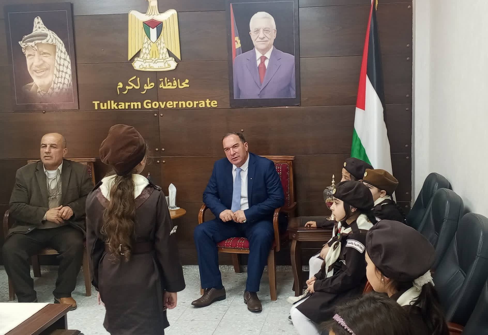 محافظ طولكرم اللواء د. كميل يستقبل وفداً من اطفال فريق الكشافة من مدرسة المناهل الخاصة