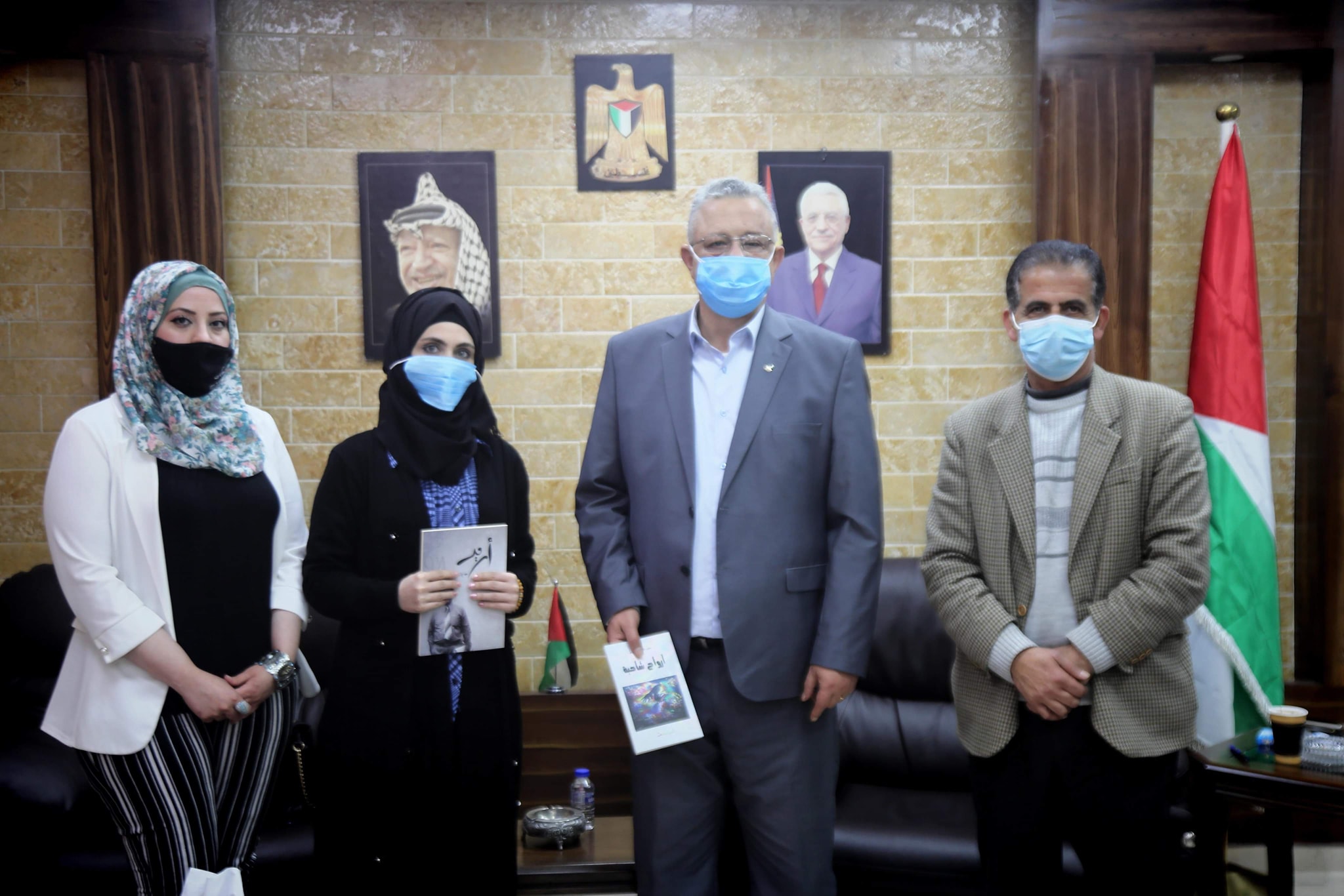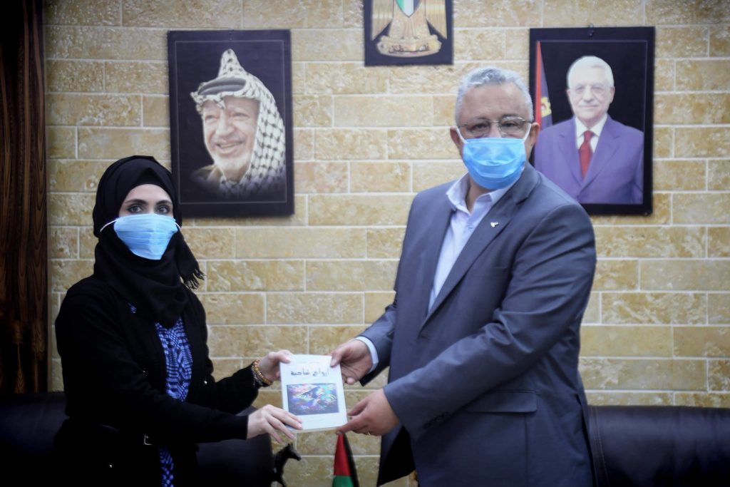 محافظ طولكرم عصام أبو بكر خلال إستقبال الكاتبة الكرمية سجى حسون، والتي سلمت للمحافظ نسخة من كتابها الأخير أرواح شاحبة.