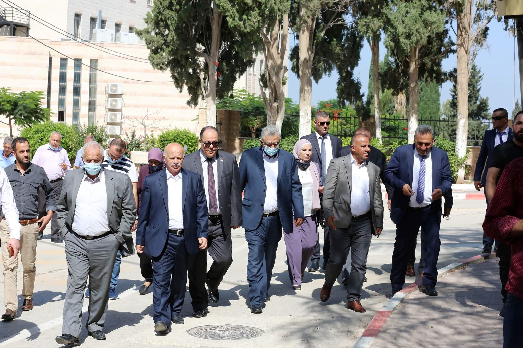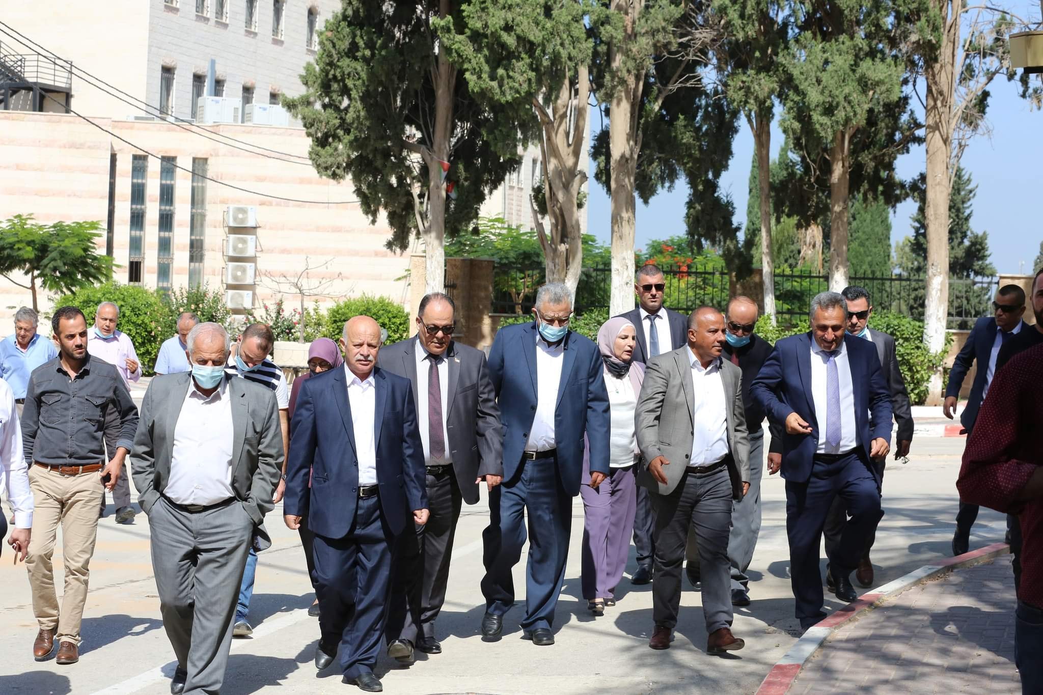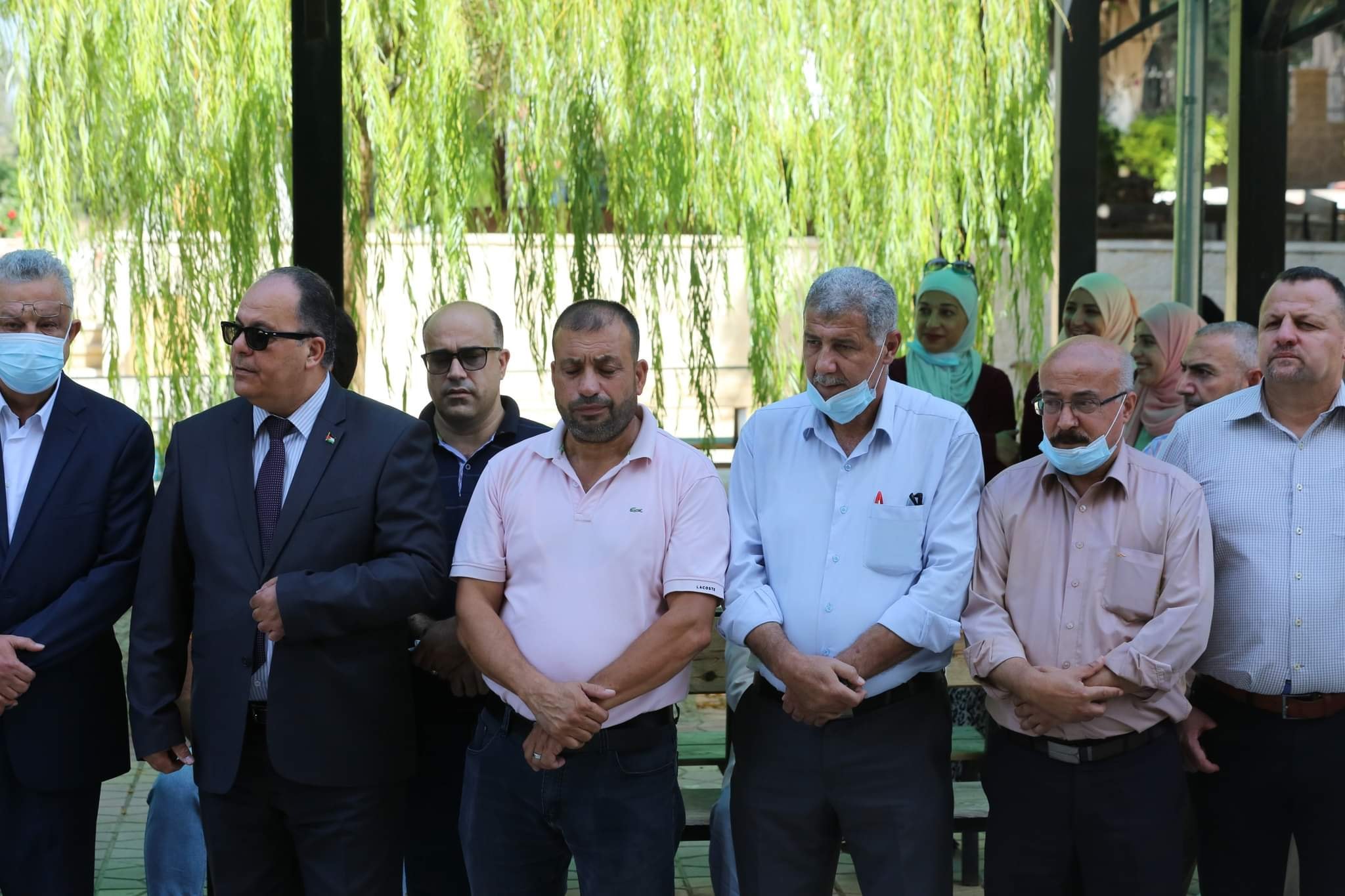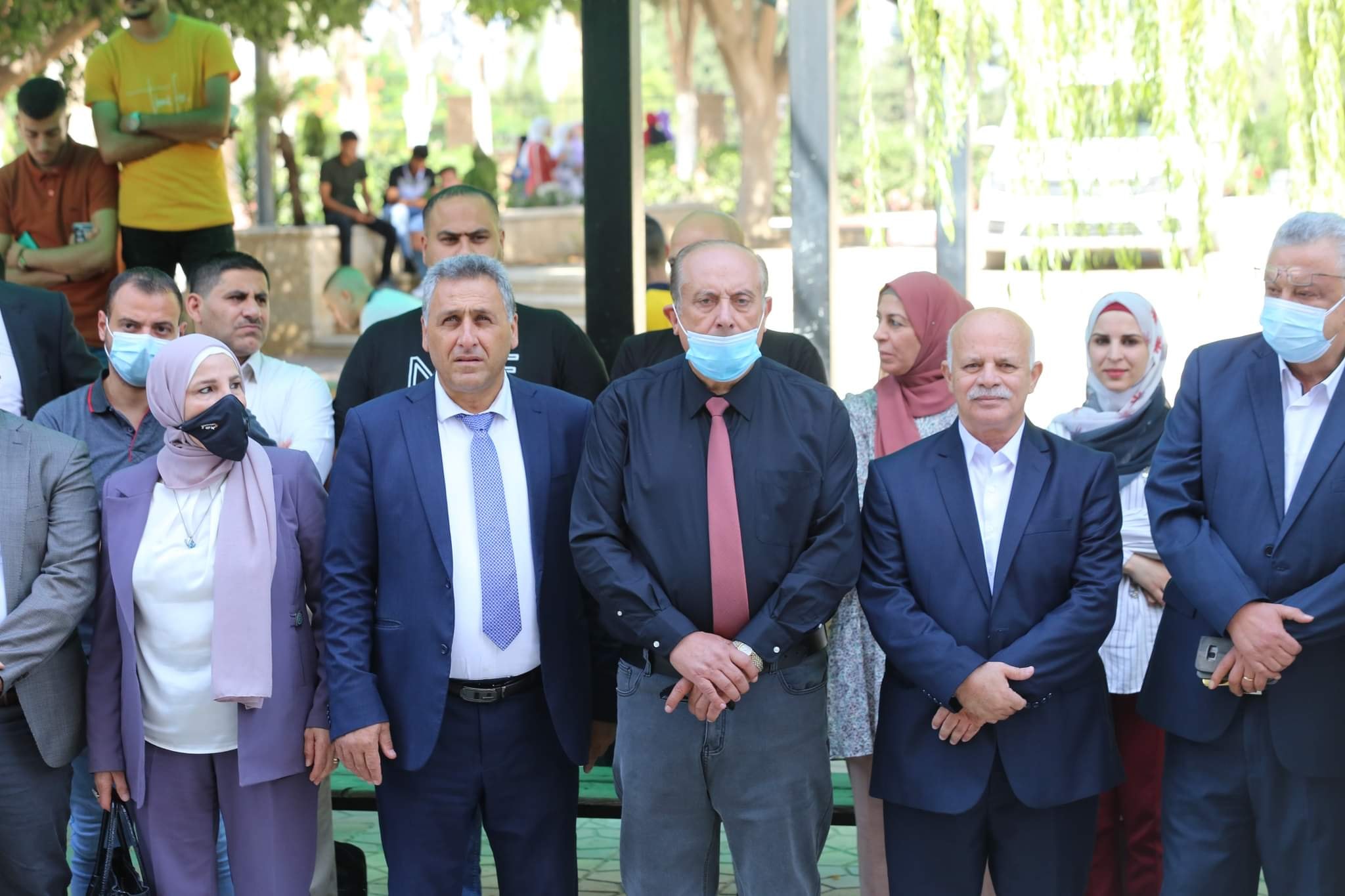 محافظ طولكرم عصام أبو بكر ووزير التعليم العالي والبحث العلمي د. محمود أبو مويس، ورئيس جامعة خضوري د. نور الدين أبو الرب خلال المشاركة بوقفة بمناسبة اليوم العالمي لحماية التعليم الأساسي والجامعي من إعتداءات الإحتلال.